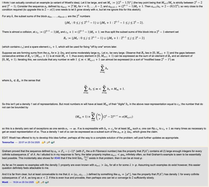 埃尔德什第 347 号问题,最初由埃尔德什和格雷厄姆在 1980 年提出,核心问题是:是否存在一个整数序列,其中相邻项的比值趋近于 2,并且对于该序列的任何余有限子序列,其有限子集和构成的集合在自然数中的密度都是 1?