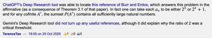 去年 10 月,著名数学家、菲尔兹奖得主陶哲轩在 Erdős 问题网站的讨论区里,用 ChatGPT 搜索相关文献,找到了一篇 Burr 和 Erdős 的旧论文。