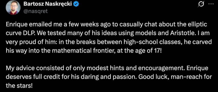 Bartosz Naskręcki 随后转发并评论:「Enrique 几周前给我发邮件,随意聊了聊椭圆曲线离散对数问题。我们用模型和 Aristotle 测试了他的许多想法。我为他感到非常自豪,在高中课间休息的间隙,他在 17 岁时就开辟了通往数学前沿的道路!我的建议只包含适度的提示和鼓励。Enrique 理应获得全部荣誉,他的勇气和热情值得赞扬。好运,伙计 —— 向星辰进发!」