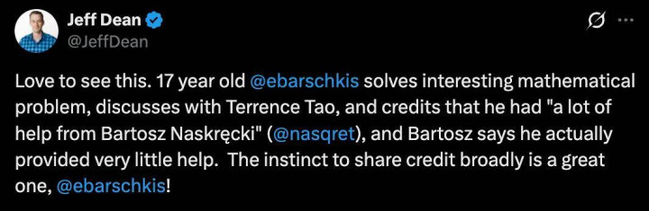 谷歌的 Jeff Dean 也转发了这条消息:「爱看这种事,17 岁的 Enrique 解决了一个有趣的数学问题,与陶哲轩讨论,并感谢 Bartosz Naskręcki 给予的『 大量帮助 』,而 Bartosz 说他实际上提供的帮助很少。这种广泛分享荣誉的本能真是太棒了!」